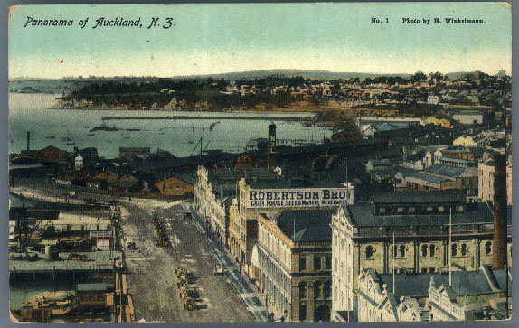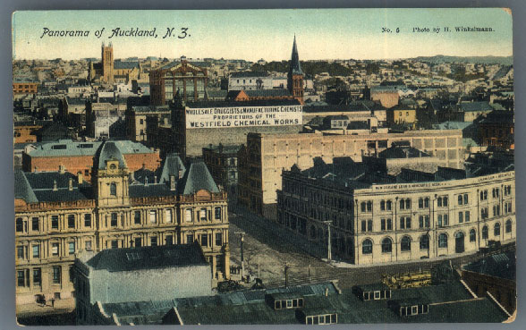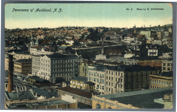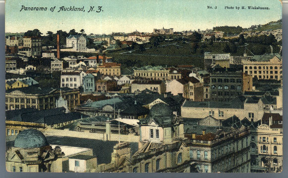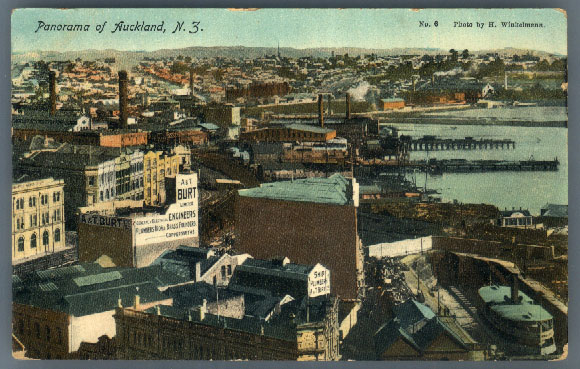 Looking east along Quay St toward un-reclaimed Mechanics Bay | Parliament Park in centre | Albert Park at centre | Mt Eden and Queen St, Town Hall clock tower (completed 1911) | Spires are St Mathews (left) and St Marys. Building front left is the Customs House | Left chimney is tramways generation plant, right: graving dock with harbour ferry. |