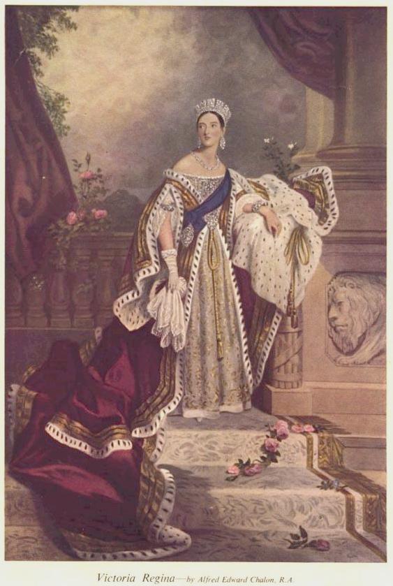 The Chalon portrait of Queen Victoria was by Alfred Edward Chalon, R.A. (1780-1860) painted in 1838, the year after she acceded to the throne. Chalon sketched the Queen on her first visit to the House of Lords in 1837 and derived the painting from that. In fact he produced three different paintings and it was much copied by other painters for official portraits. These, engravings and mezzotint copies of the portrait made it a well known image in early Victorian times.