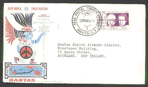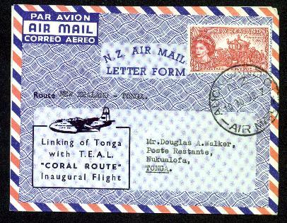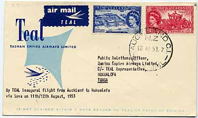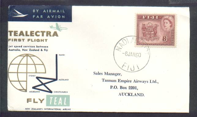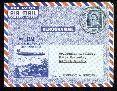 The service through Norfolk to Fiji started in 1947 with an RNZAF Dakota, but switched in the same year to NZ National Airways Corporation (NAC) DC3s. NAC stopped other Pacific services in 1952 but continued to Norfolk until 1955 (4 September). From 1955 (6 November) to 1975 the service was operated by a Qantas DC4 under charter to TEAL as an extension of the Qantas Sydney-Norfolk route. The cover depicts a TEAL DC6 so it perhaps marks some TEAL sensitivity about not using its own aircraft!. From 1975 TEAL used chartered NAC F27 500 Friendships on the route and from 1984 Air New Zealand used Boeing 737s.