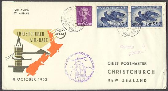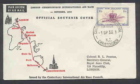 Covers were carried by the New Zealand entry in the race, an RNZAF Handley Page Hastings. They were official New Zealand mail on the journey to London and delivered by the British Post Office. The return journey was not sanctioned by the British but was carried as unofficial mail. The plane did not complete the race flight to Christchurch, diverting to Auckland after engine trouble on route.