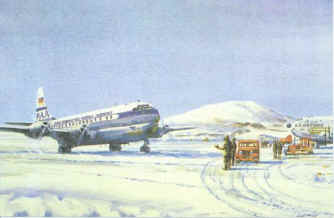 Artist's impression of the scene at McMurdo. The C124 Globemaster II in the right background was a military equivalent of the Stratocruiser, slower but hauling more. As a child in Dunedin I saw fleets of these pass overhead on their way from Christchurch to Antarctica.