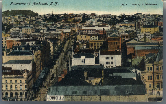 Looking east along Quay St toward un-reclaimed Mechanics Bay | Parliament Park in centre | Albert Park at centre | Mt Eden and Queen St, Town Hall clock tower (completed 1911) | Spires are St Mathews (left) and St Marys. Building front left is the Customs House | Left chimney is tramways generation plant, right: graving dock with harbour ferry. |