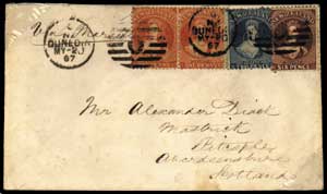 The Imperforate Issues Britain had commenced perforating its stamps in 1854 so it is perhaps surprising that New Zealand did not immediately commence on this. Perhaps it was the desire for local printing and the added complication which perforation added which discouraged its early adoption. The stocks arrived in 1855 and the stamps were first used in July of that year. They were on star watermarked paper (the background to this page) starting a tradition of star watermarks in New Zealand stamps which continued until the 1970's. Local printing commenced immediately, not using the supplied press but a commercial press of J. Richardson - the "Richardson" prints, with a trial using the supplied paper and then moving onto other stocks of paper. The papers used were quite variable. Paper was a scarce commodity in early colonial New Zealand. They are unwatermarked apart from occasional portions of a makers name in double lined letters. The 6d and 3d values were a later addition to the range. In each case the plates came from London and were accompanied by further stocks of star watermarked paper, which was not initially used. The early postage rates were 2d per half ounce for an internal letter and 6d per half ounce for a letter to Britain (See cover) - the source of the majority of New Zealand immigrants. Consequently these two are the commonest stamps. The early covers with the 1d value is most commonly found with two specimens making up the standard 2d postage. The 1d value had a short period as the legitimate local rate within Canterbury Province and was also a concession rate for servicemen. This was the time of the land wars and imperial regiments and Royal Navy ships were stationed in New Zealand. The initial lack of a 6d value caused the 1/-, which was in good supply, to be used bisected within Otago Province. The 2d being the most common in use has the greatest number of catalogued varieties. In 1862 a Mr John Davies arrived to take up the post of government stamp printer. Thereafter he undertook all printings utilising the originally supplied press - the "Davies" prints. These printings reverted to using the previously supplied star watermark paper but other papers were used as well, some with other watermarks. |