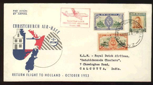 Covers were carried by the New Zealand entry in the race, an RNZAF Handley Page Hastings. They were official New Zealand mail on the journey to London and delivered by the British Post Office. The return journey was not sanctioned by the British but was carried as unofficial mail. The plane did not complete the race flight to Christchurch, diverting to Auckland after engine trouble on route.