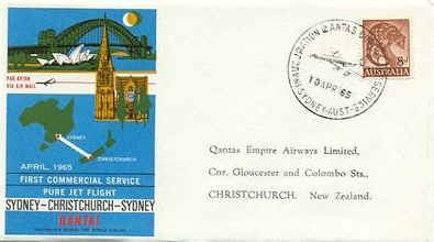 1965 Inaugural Qantas Jet Service - Sydney - Christchurch. April 10. Boeing 707, VH-EBL "City of Geelong"