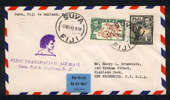 The service through Norfolk to Fiji started in 1947 with an RNZAF Dakota, but switched in the same year to NZ National Airways Corporation (NAC) DC3s. NAC stopped other Pacific services in 1952 but continued to Norfolk until 1955 (4 September). From 1955 (6 November) to 1975 the service was operated by a Qantas DC4 under charter to TEAL as an extension of the Qantas Sydney-Norfolk route. The cover depicts a TEAL DC6 so it perhaps marks some TEAL sensitivity about not using its own aircraft!. From 1975 TEAL used chartered NAC F27 500 Friendships on the route and from 1984 Air New Zealand used Boeing 737s.