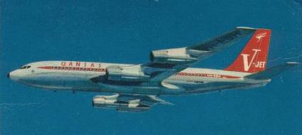 The "V Jet" referred to the fan jet engines Qantas had on its 707's, V for vanus, fan - they were high by-pass engines for their day. Qantas had a special long range version.