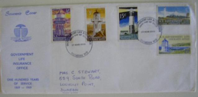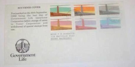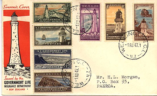 What is an insurance business doing with its own stamps? A philosophy held by New Zealand Governments until the late 20th Century was that it was a good idea for government to be involved in many fields of commerce - so as to keep the others honest. Insurance was one of those fields. The Government started a Government Life Insurance Department in 1869. It did not restrict itself to life insurance and late in its existence sold other sorts of policies. A lighthouse was used as its corporate symbol. When sea travel was the only way New Zealand was linked to the rest of the world and a common experience of many, the symbolism of safety aligned with a lighthouse must have been more powerful than perhaps it is today. As a government insurance business, it gained the right to use its own stamps after disagreements with the Post Office about how much postage it owed. Of course it chose to use lighthouses on its stamps. The stamps were available to collectors through the post office but were never authorised for general use. First day covers were available to general purchasers. Only the business could use them for general postage though there was an exception applying only on the first day of issue of the 1947 series. The words New Zealand do not appear on any of the stamps - only the common abbreviation, N.Z. Nor did the monarch's portrait ever appear in the series. These are both indications of how the series was kept separate from the normal issues of the Post Office. Customers and agents of the business who were also philatelists then collected a small bonus in postally used stamps. Postally used stamps of the 1947 onwards issues are not that common and some catalogues even show them at a premium over mint. Few were used internationally. The name of the business changed from "Department" to "Office" and this shows on the later stamps. In reality the insurance operation which went under the Government's name was a mutual insurance company with a relatively light Government involvement. In 1989 the Government stepped back from any involvement leaving it entirely in the hands of the policy holders. Consistent with this the "government" part of the name was dropped and it became Tower Insurance. It de-mutualised in 1999 and is now Tower Corporation. The use of the name Tower and the ongoing use of a lighthouse as a corporate symbol reflects its history. It has recently issued stamps again - through NZ Post